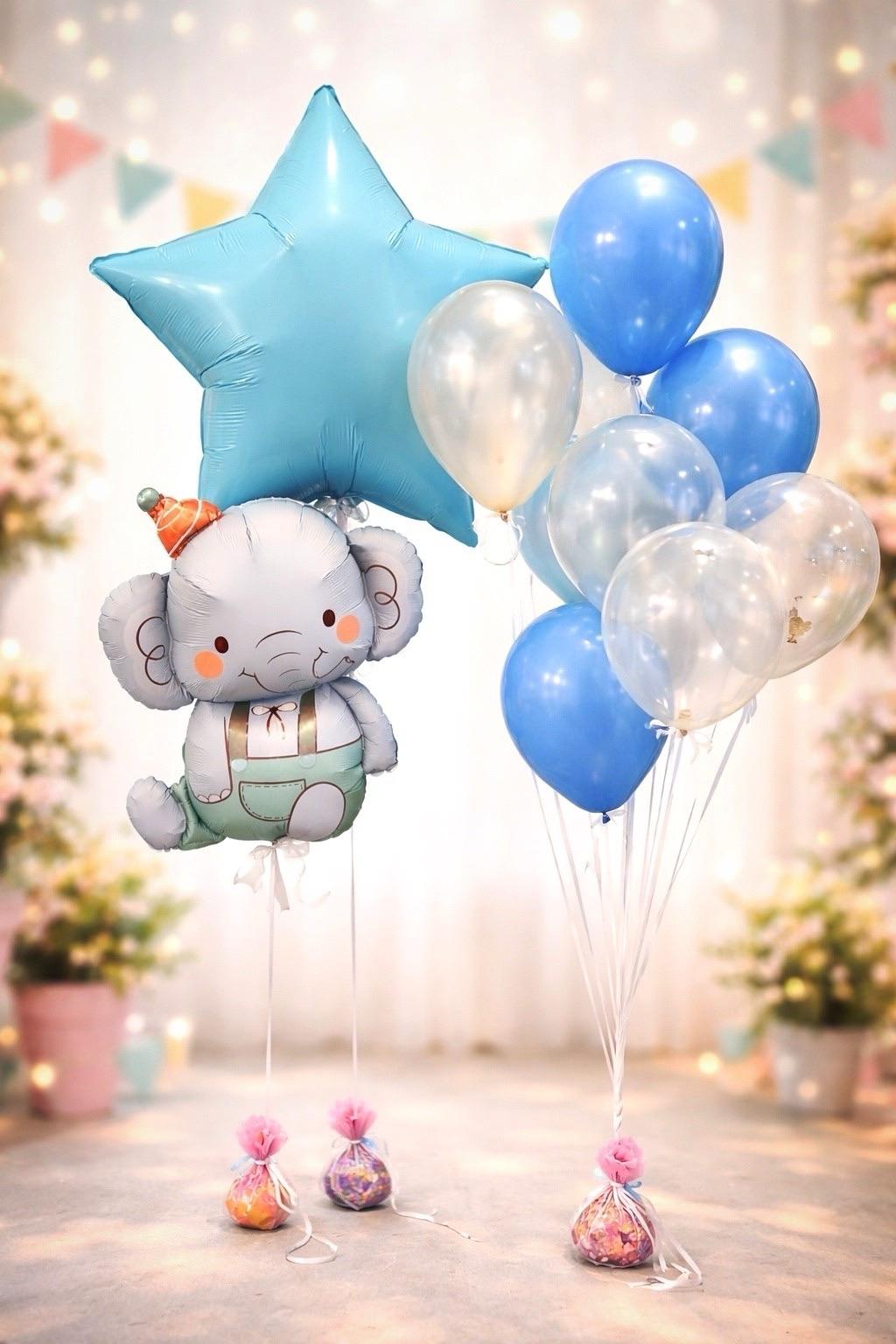 Композиция состоит из 9-ти латексных шаров(30см) И 2 фольгированных шара ⭐Синяя звезда 79см⭐ 🐘Слоник 89см🐘 Можно выбрать любую цветовую гамму на Ваш вкус. Подберём любую композицию под Ваш бюджет! Для заказа можете написать в сообщения группы. Наша команда подарит волшебство на Ваш праздник🔥 🎈 Доставка 24/7🚘Москва И МО. Мытищи бесплатно